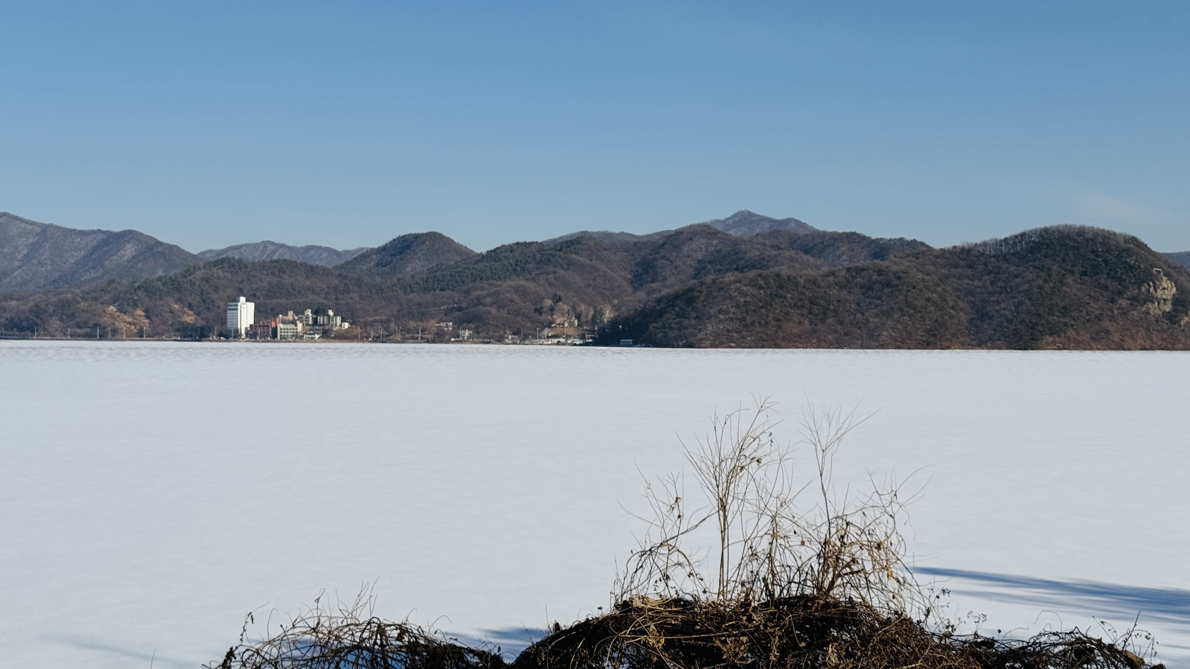 근 2주가량 영하 10도 안팎에 강추위로 팔당호가 거의 다 얼어있었는데, 전 날 온 눈으로 정말 하얗게 변해있었다.